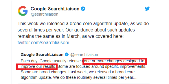 Pada kicauan akun resmi tersebut, tersurat alasan bahwa tujuan Google merilis update Algoritma tak lain ialah “to improve our results” alias untuk meningkatkan kualitas hasil pencariannya.